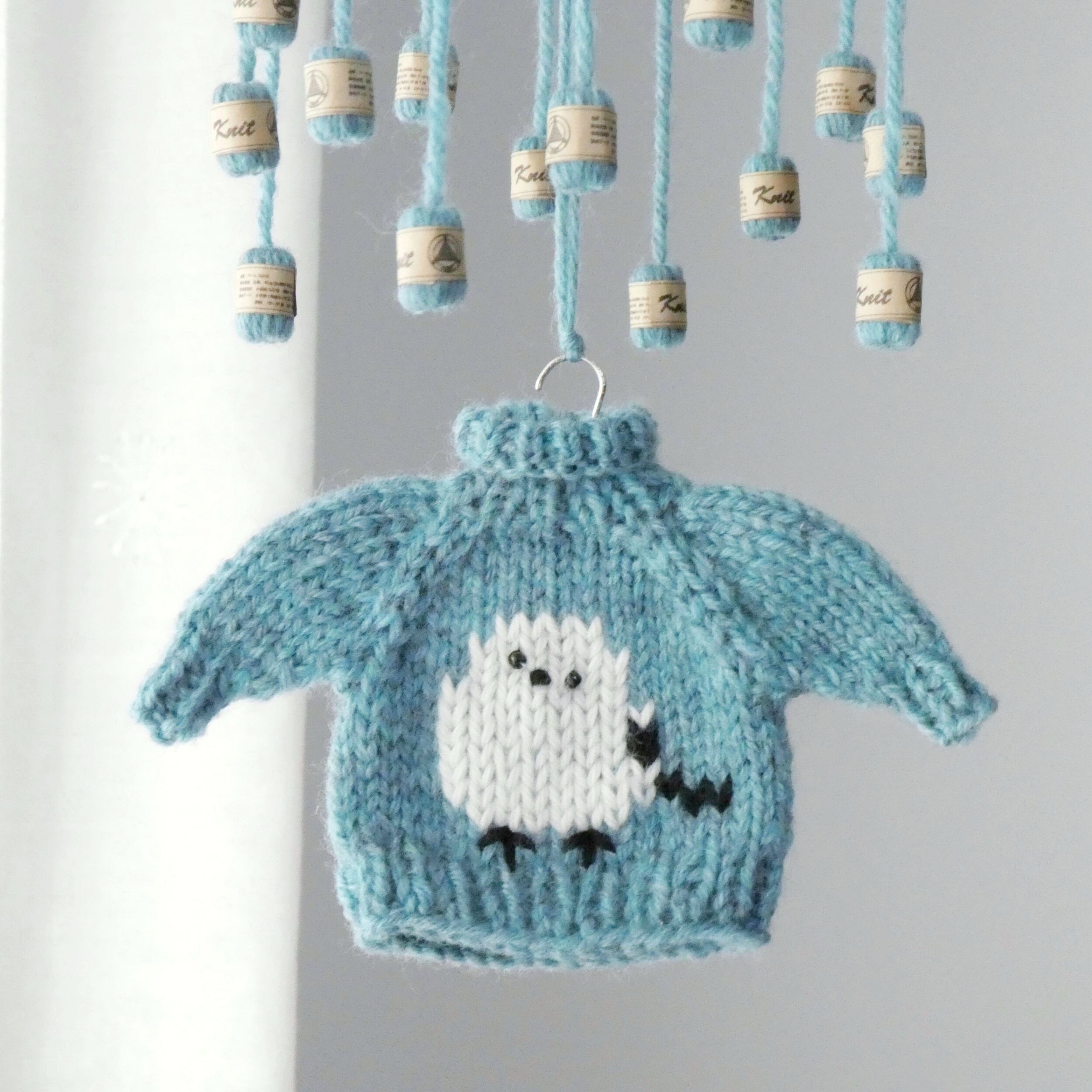 シマエナガのニットのモビール/小さなセーターとミニチュア毛糸玉/水色/受注制作-Knit Mobile: Mini Sweater with Shimaenaga (Cute Japanese Bird ) Embroidery & Yarn Balls