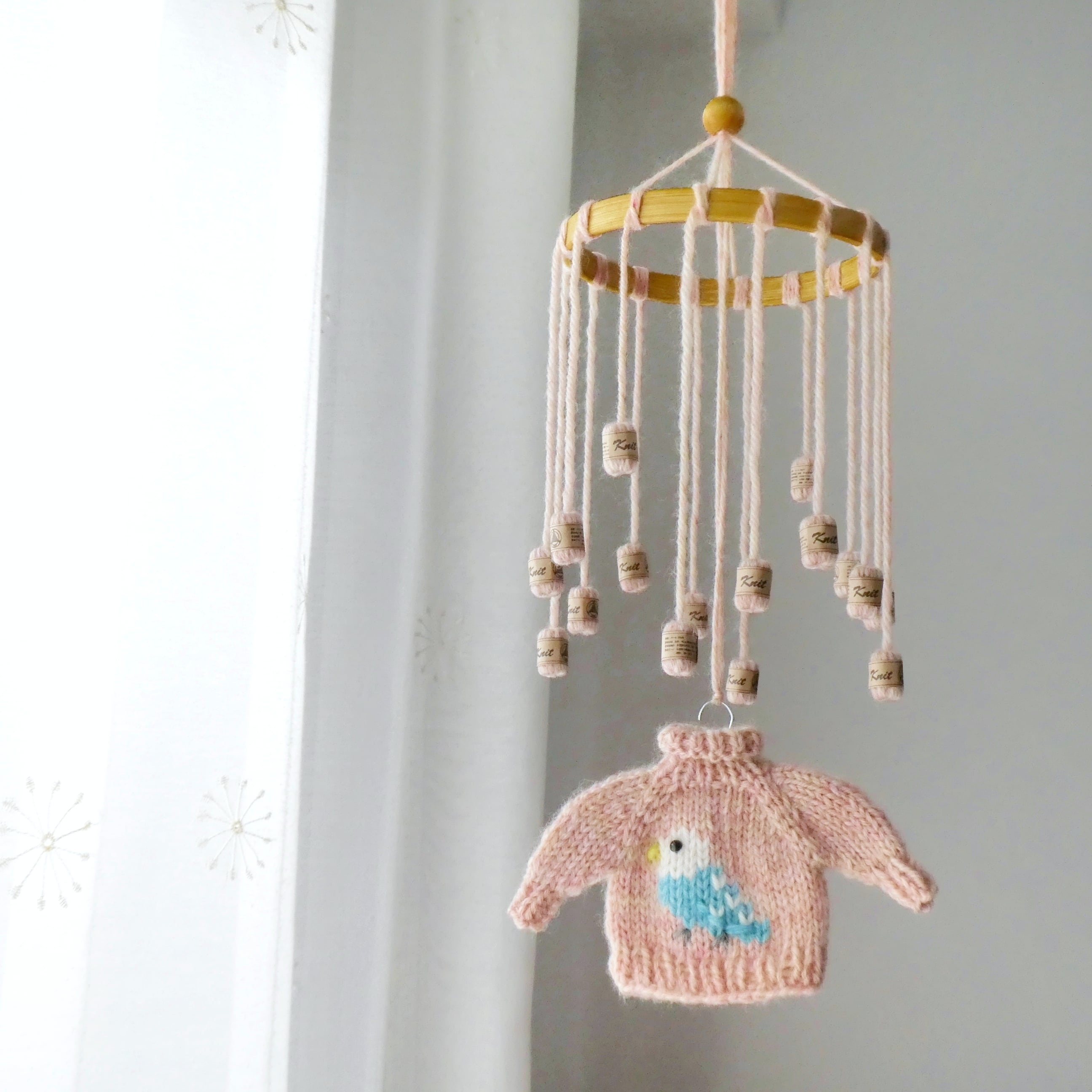 セキセイインコのニットのモビール/小さなセーターとミニチュア毛糸玉/薄ピンク/受注制作-Knit Mobile: Mini Sweater with budgie Embroidery & Yarn Balls