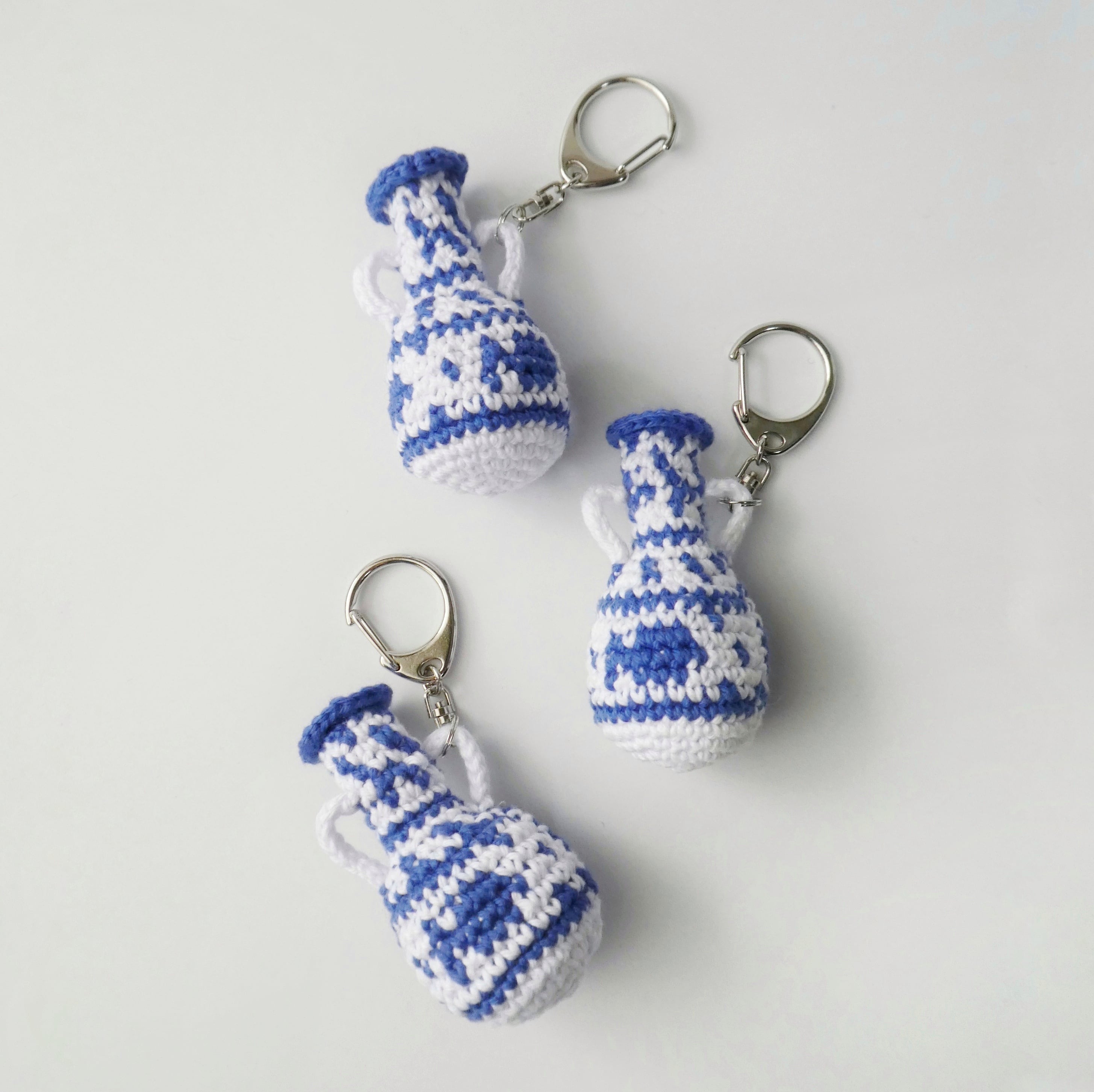 伝統的な陶磁器のような模様を、毛糸で編んで楽しむあみぐるみの編み図です。