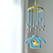コザクラインコのニットのモビール/小さなセーターとミニチュア毛糸玉/水色/受注制作-Knit Mobile: Mini Sweater with Peach-faced Lovebird Embroidery & Yarn Balls | kana1987 | 手編みのインテリアと雑貨の店