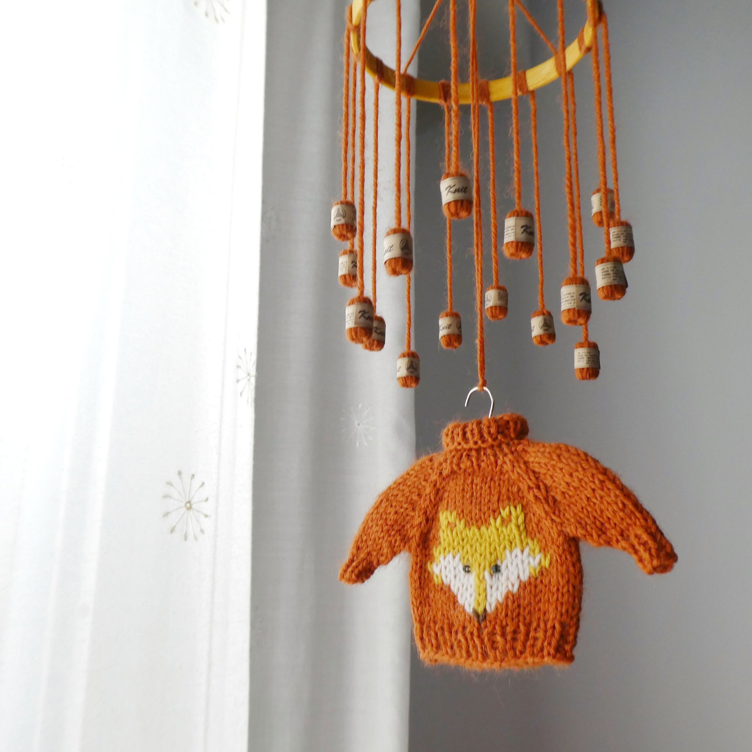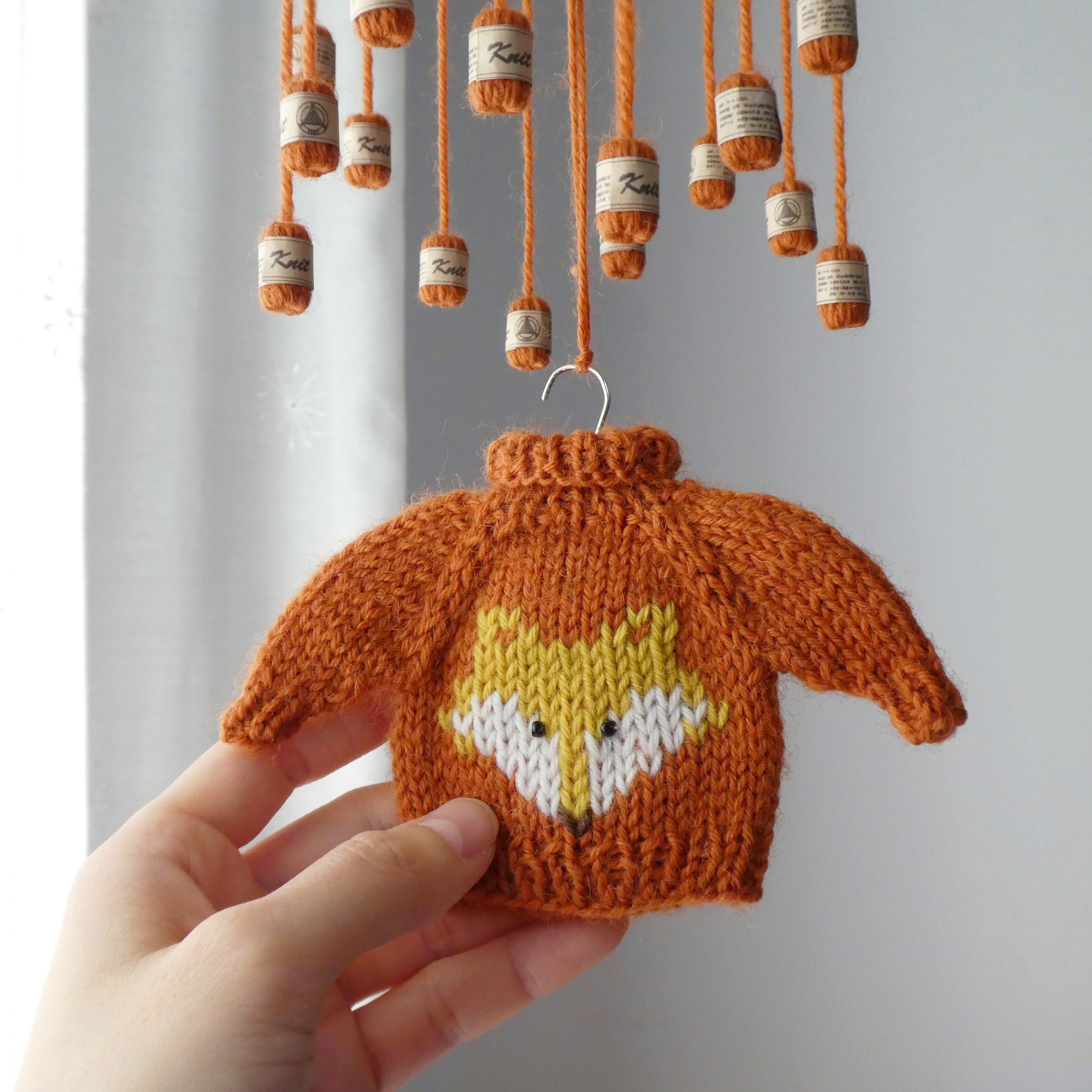 キツネのニットのモビール/小さなセーターとミニチュア毛糸玉/サンセットオレンジ/受注制作-Knit Mobile: Mini Sweater with Fox Embroidery & Yarn Balls