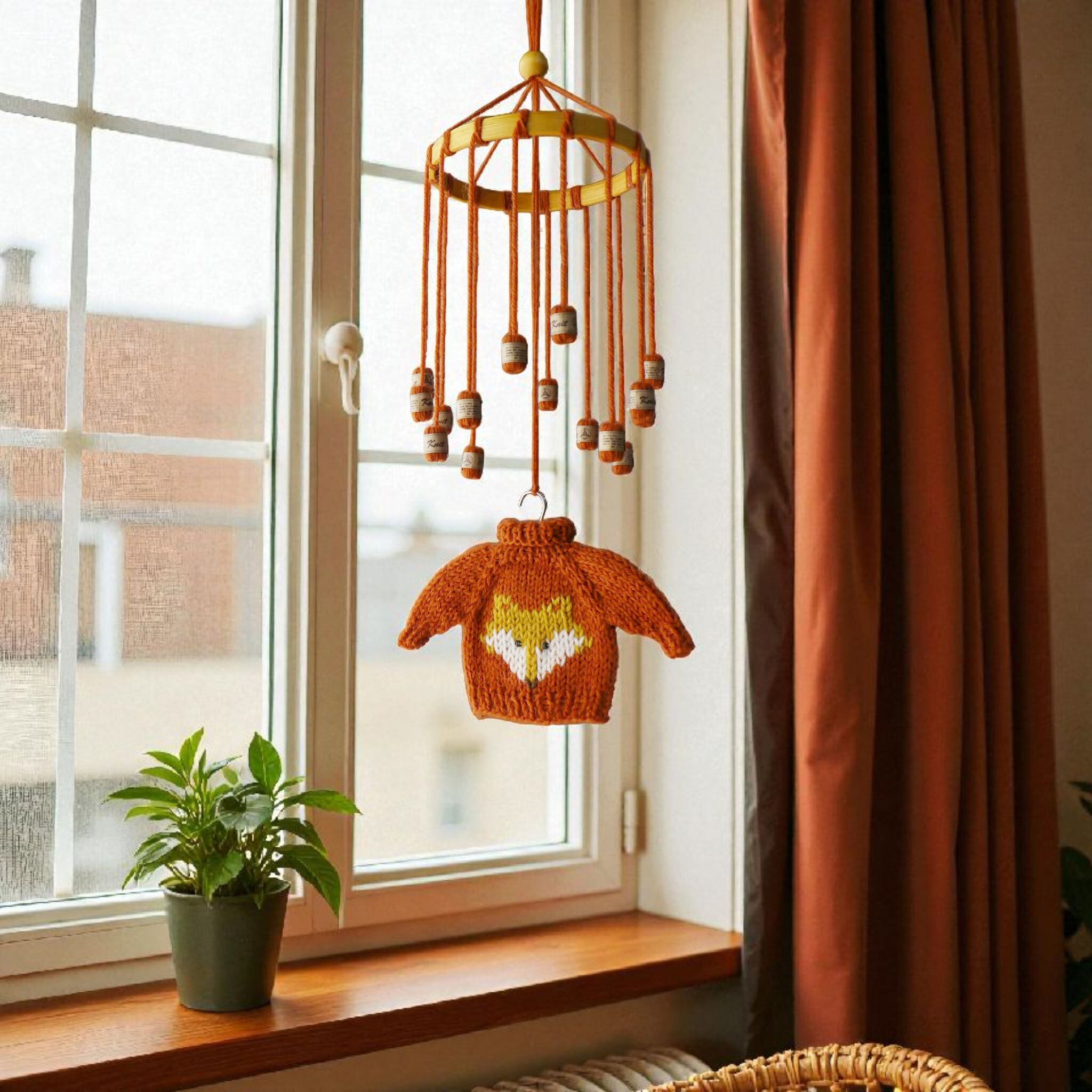 キツネの刺繍が入った手のひらサイズのセーターと、小さな毛糸玉をたくさん吊り下げた、あたたかみ溢れるモビールです。