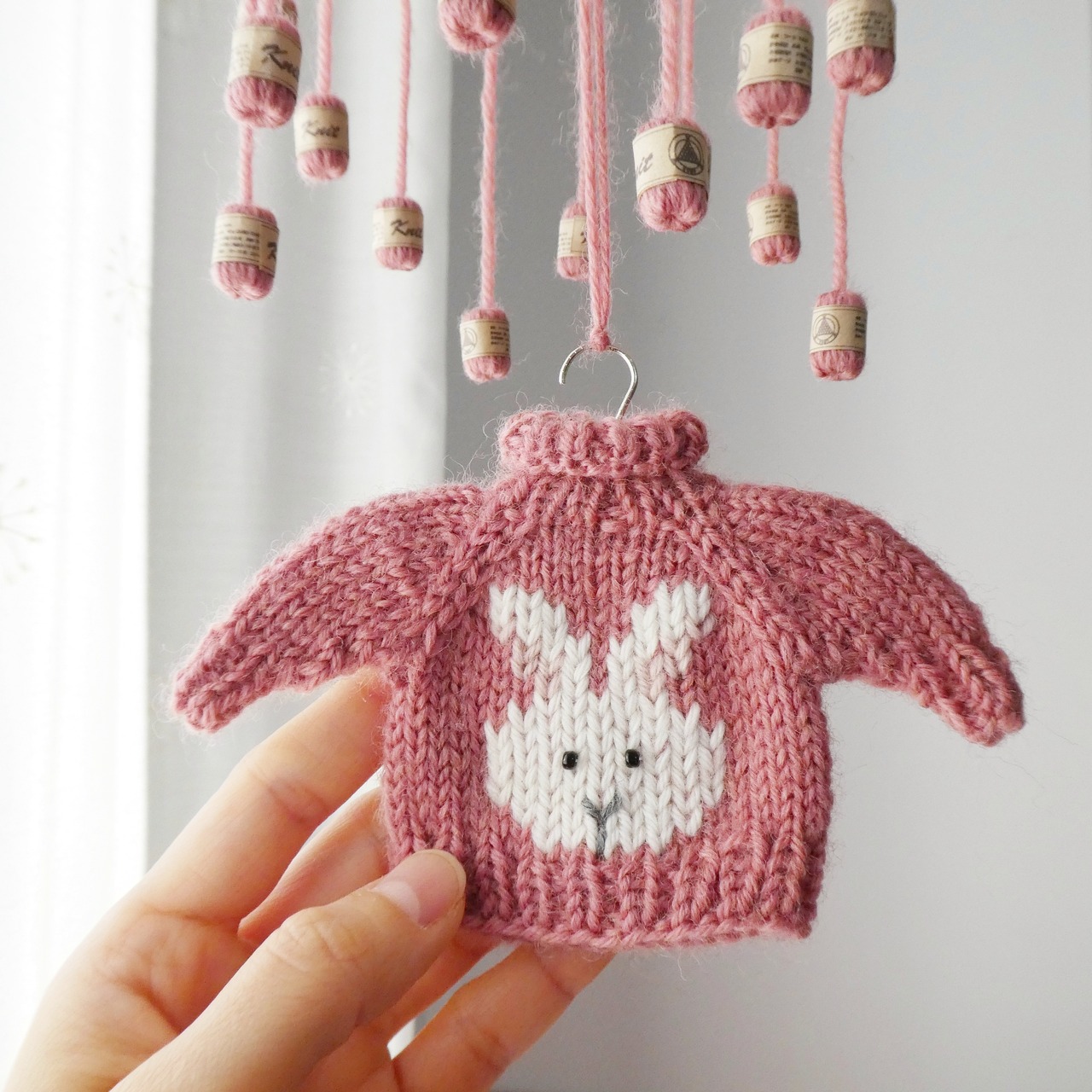 うさぎのニットのモビール/小さなセーターとミニチュア毛糸玉/ピンク/受注制作-Knit Mobile: Mini Sweater with Rabbit Embroidery & Yarn Balls | kana1987 | 手編みのインテリアと雑貨の店