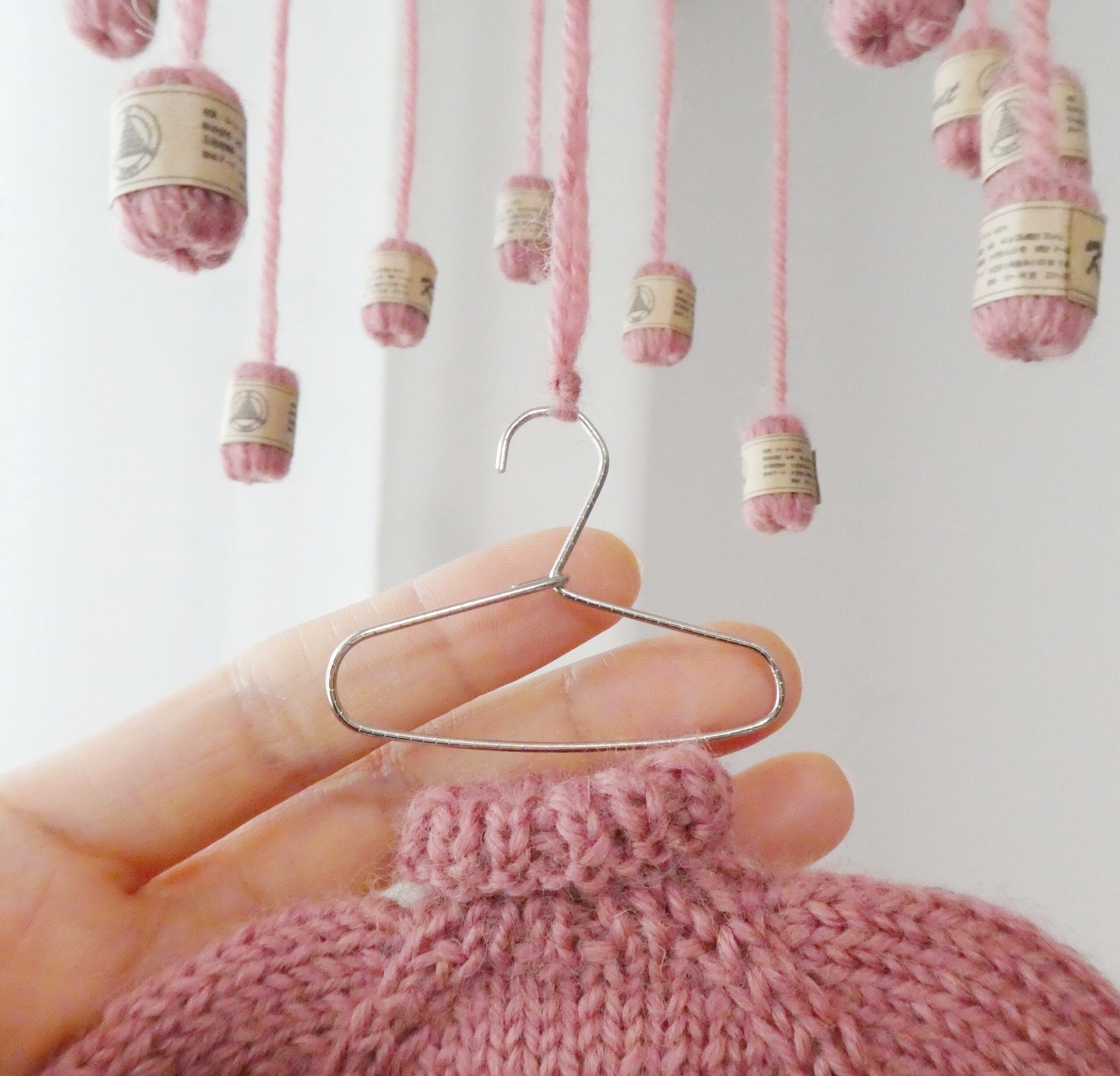 うさぎのニットのモビール/小さなセーターとミニチュア毛糸玉/ピンク/受注制作-Knit Mobile: Mini Sweater with Rabbit Embroidery & Yarn Balls