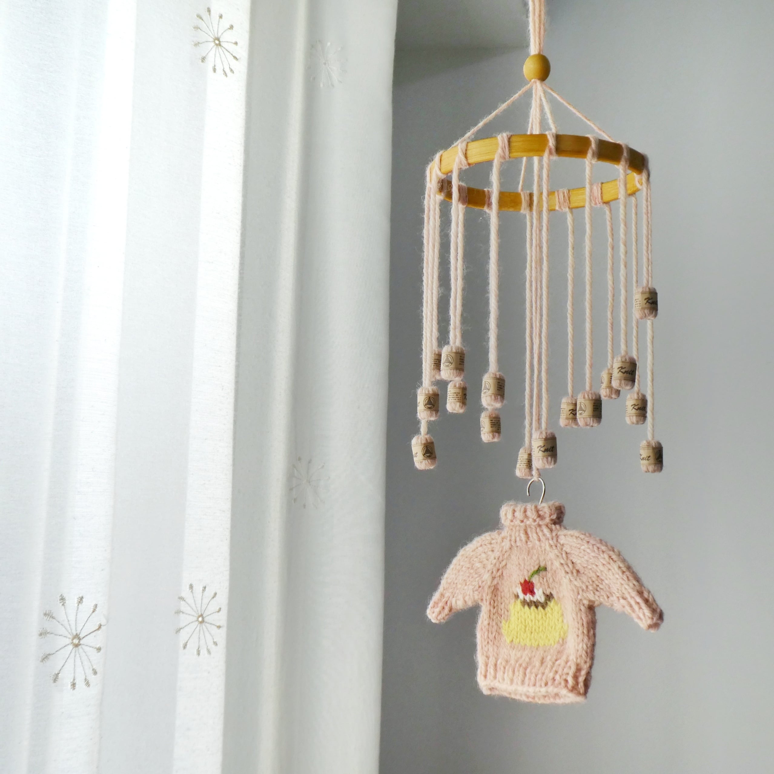 プリンの刺繍が入った手のひらサイズのセーターと、小さな毛糸玉をたくさん吊り下げた、あたたかみ溢れるモビールです。