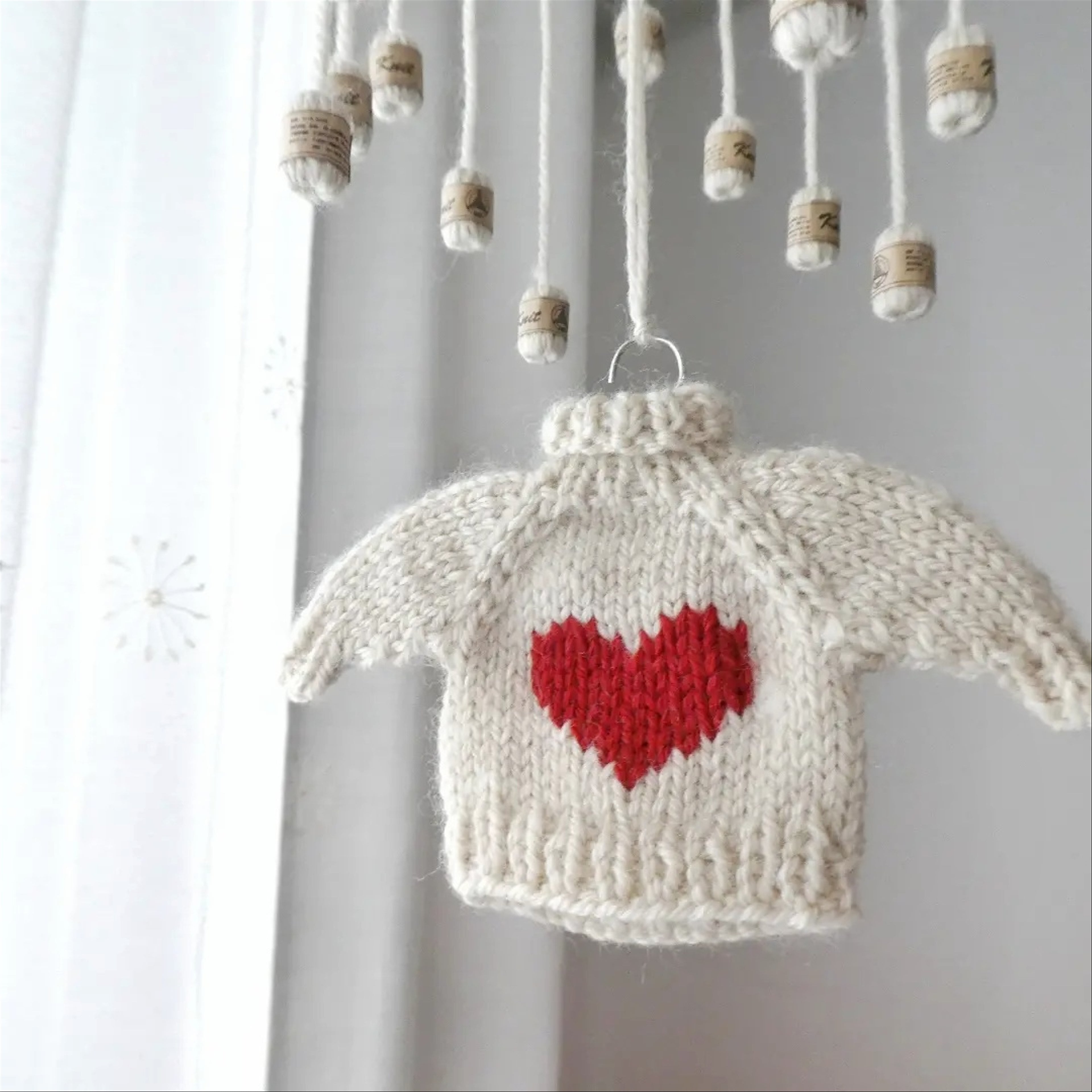 ハートのニットのモビール/小さなセーターとミニチュア毛糸玉/アイボリー/受注制作–Knit Mobile: Heart-Embroidered Sweater & Yarn Balls