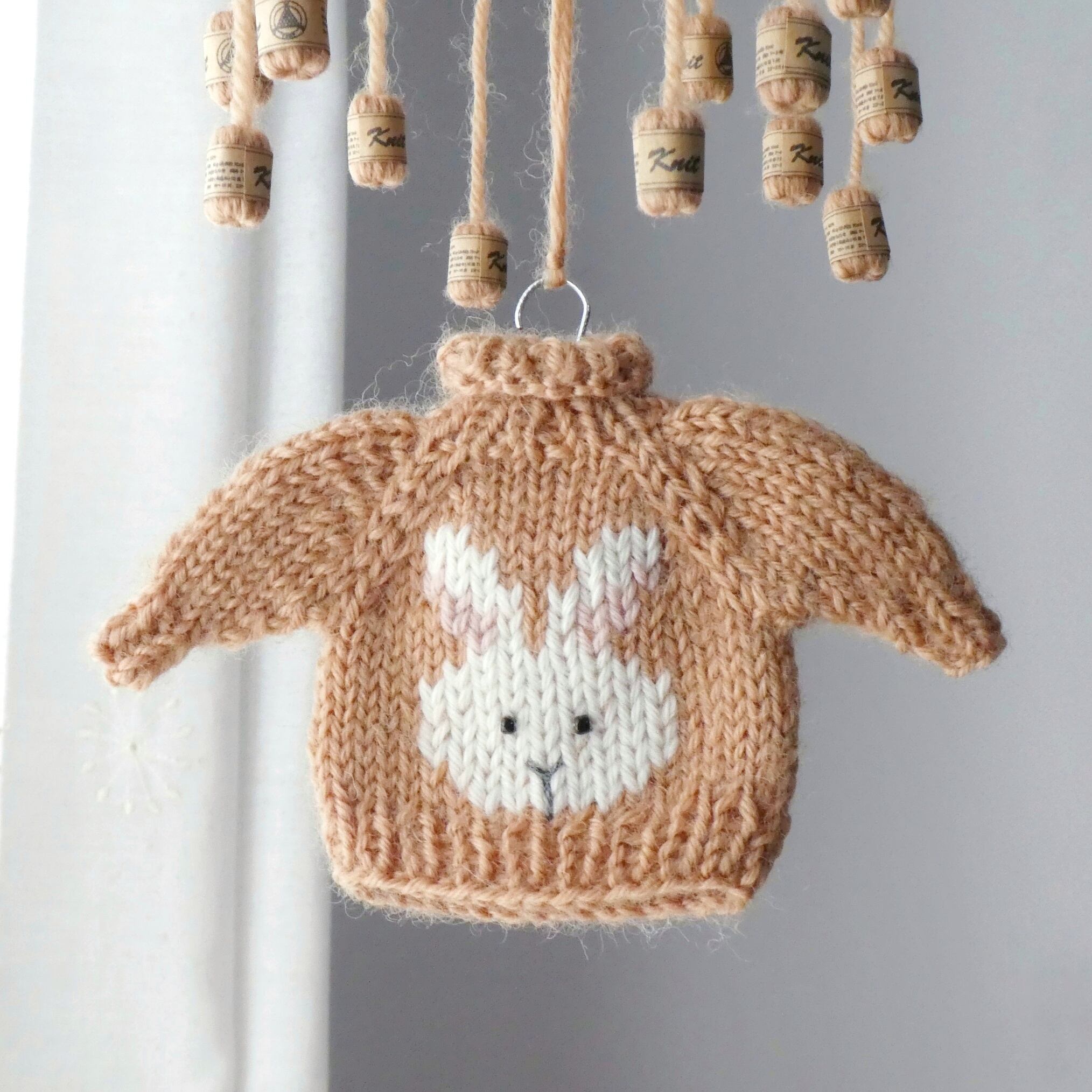 うさぎのニットのモビール/小さなセーターとミニチュア毛糸玉/ミルクティ色/受注制作-Knit Mobile: Mini Sweater with Rabbit Embroidery & Yarn Balls