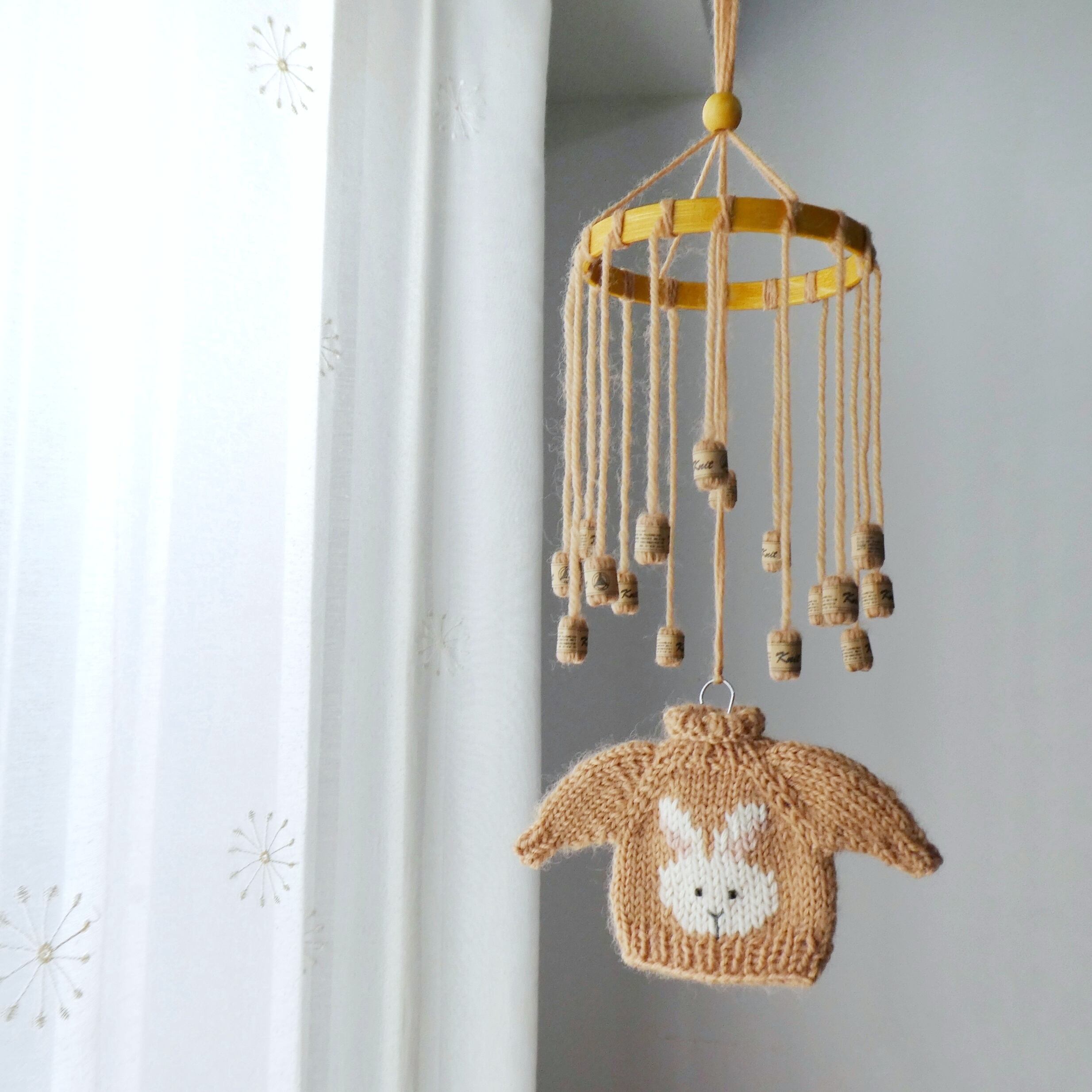 うさぎの刺繍が入った手のひらサイズのセーターと、小さな毛糸玉をたくさん吊り下げた、あたたかみ溢れるモビールです。