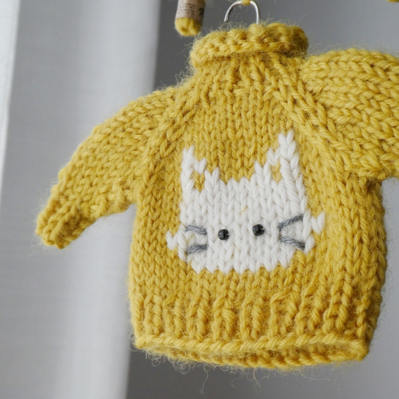 白ねこのニットのモビール/小さなセーターとミニチュア毛糸玉/イエロー /受注制作-Knit Mobile: Mini Sweater with Cat Embroidery & Yarn Balls | kana1987 | 手編みのインテリアと雑貨の店