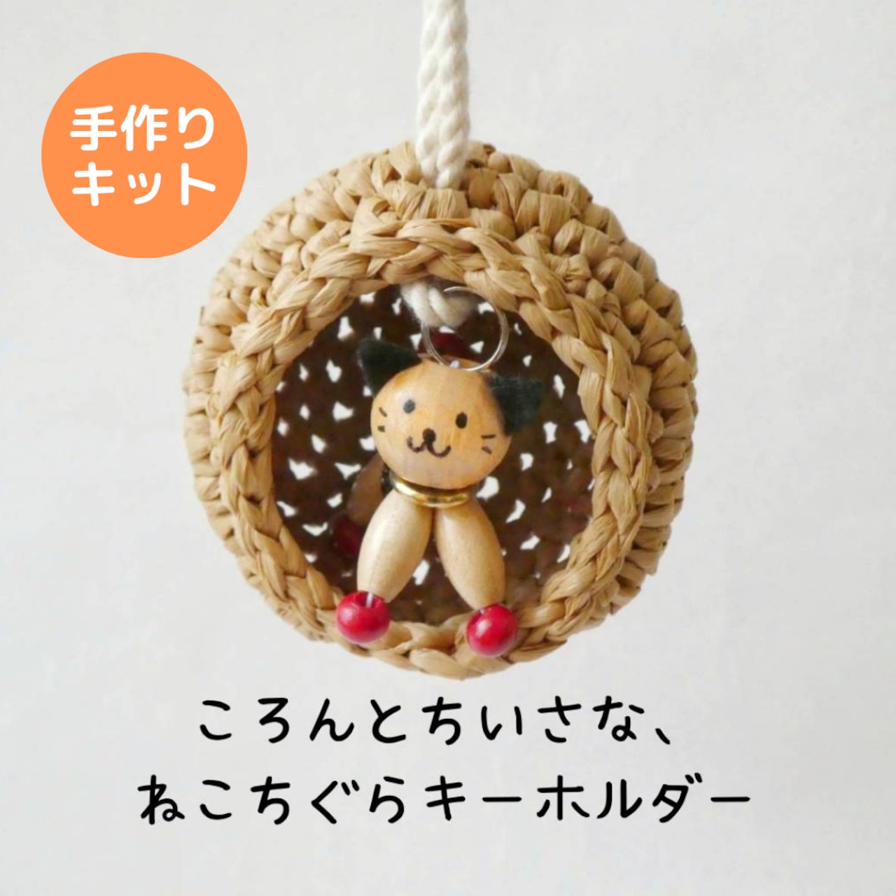 そんな猫ちぐらをモチーフに、自然素材のコットンラフィアをかぎ針編みで編んで作る、キーホルダーキットをご用意しました。