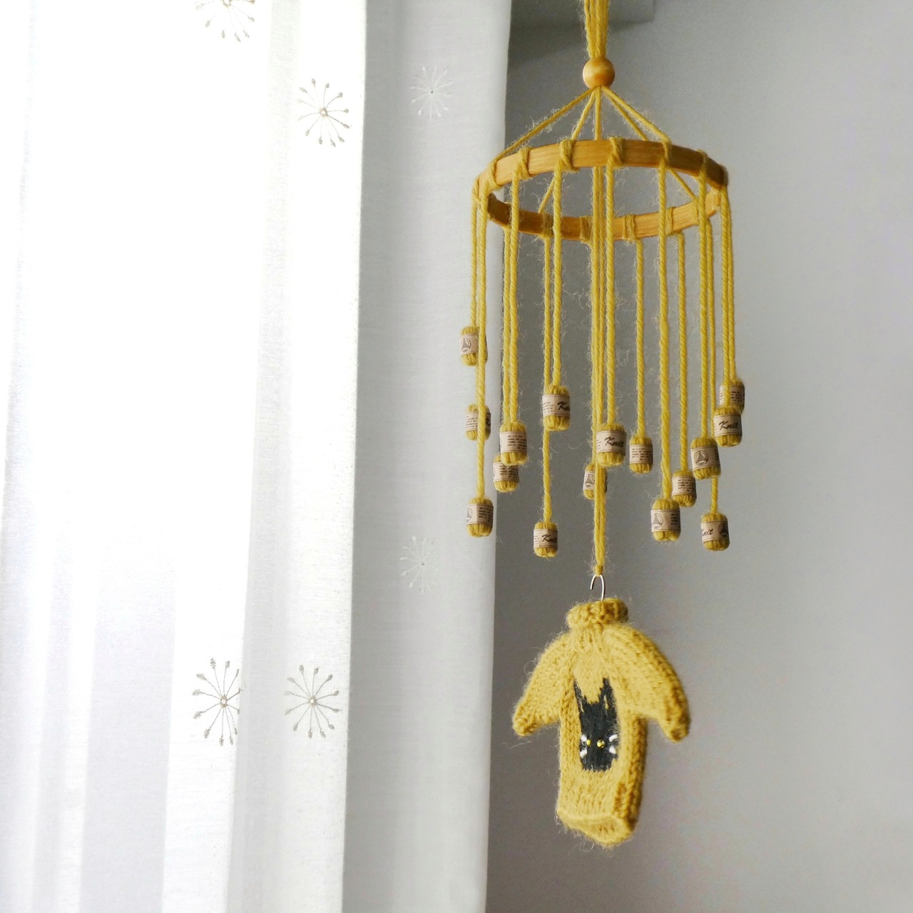 黒ねこのニットのモビール/小さなセーターとミニチュア毛糸玉/イエロー/受注制作–-Knit Mobile: Mini Sweater with Cat Embroidery & Yarn Balls | kana1987 | 手編みのインテリアと雑貨の店