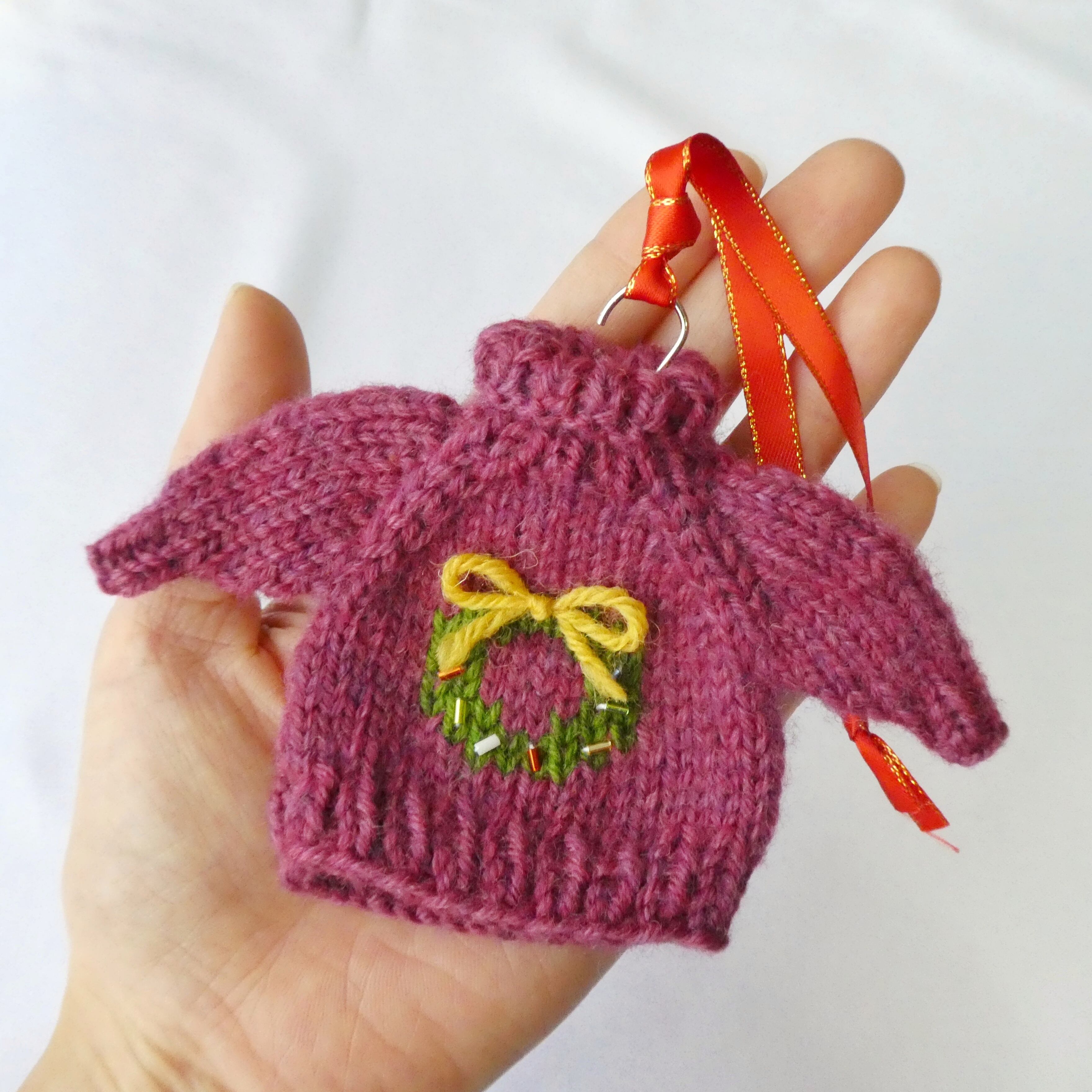手のひらサイズのセーターは、棒針編みで、1つ1つ丁寧に