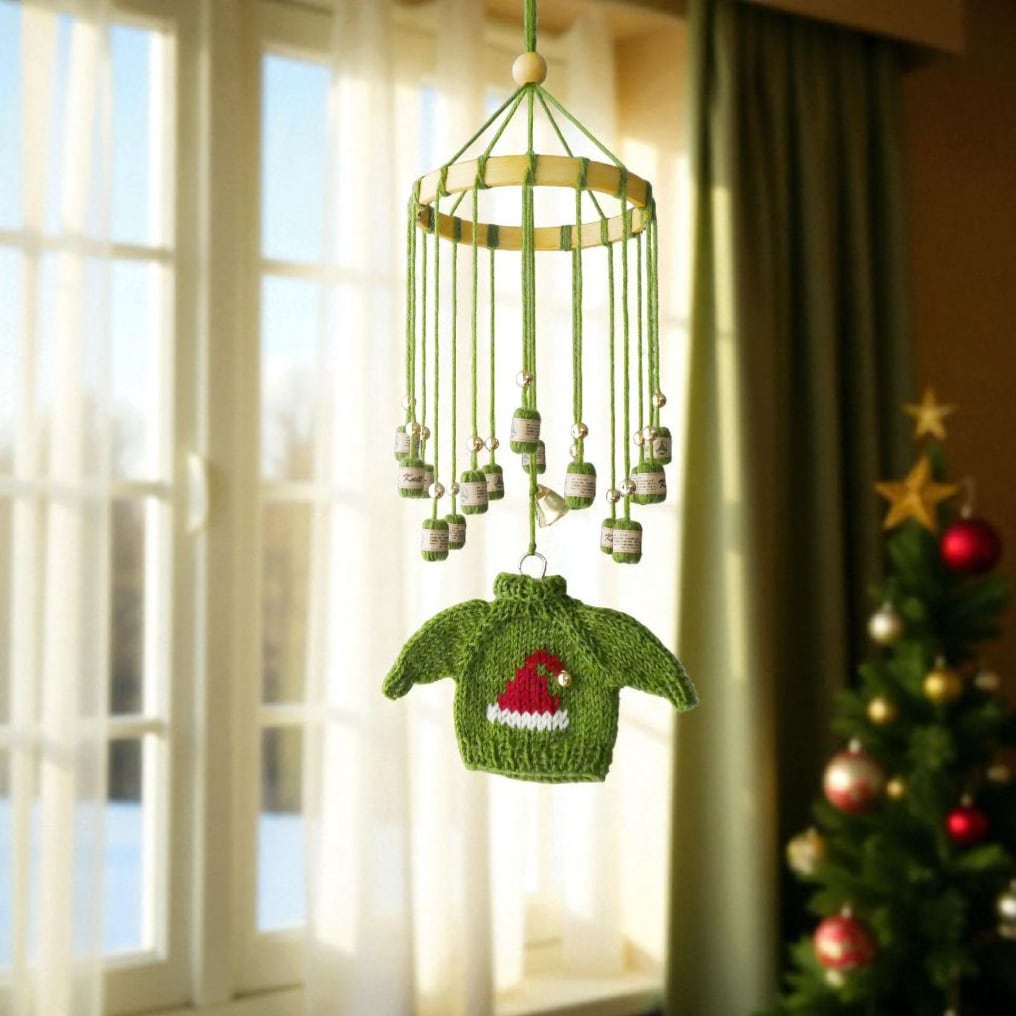 クリスマスのニットのモビール/小さなセーターとミニチュア毛糸玉/サンタの帽子/グリーン/受注制作– Knit Mobile: Christmas Mini Sweater & Yarn Balls