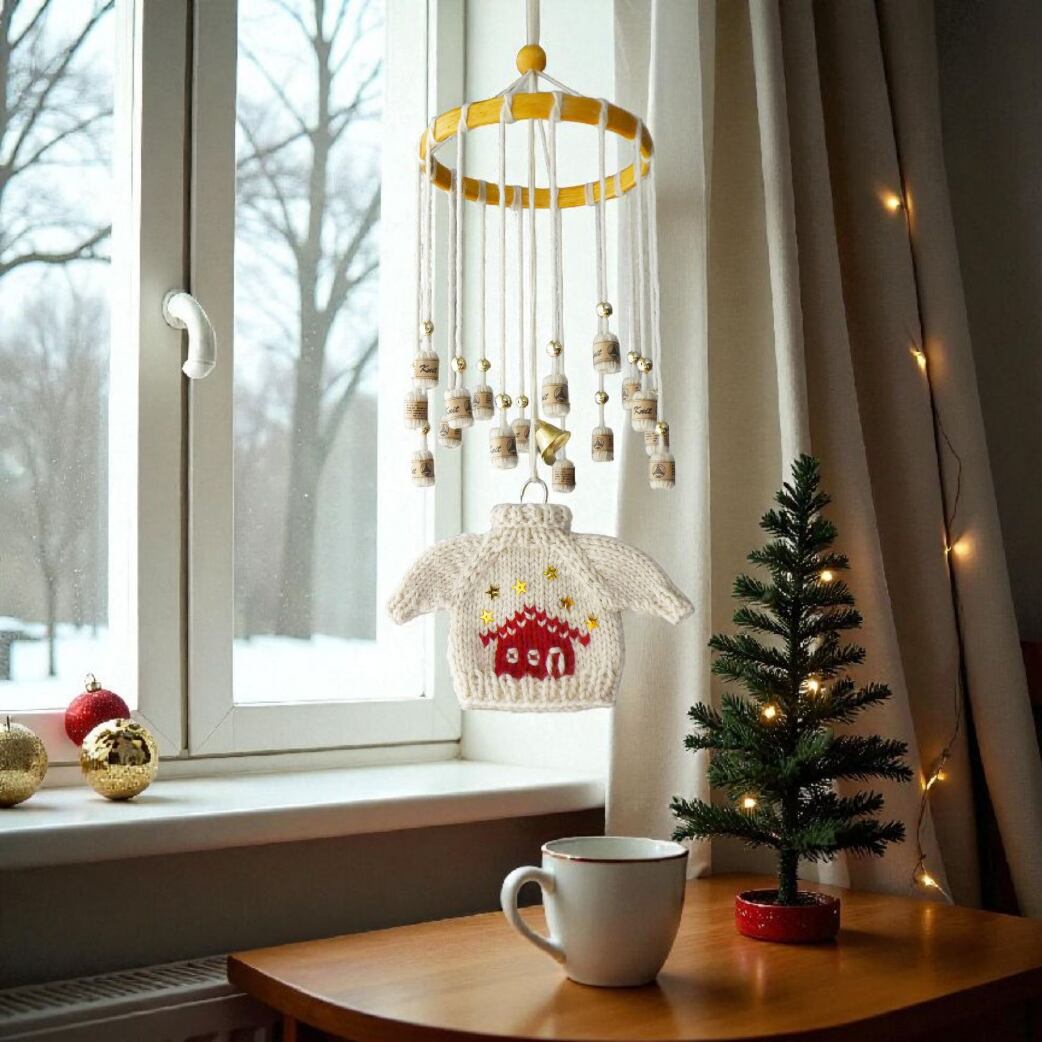 赤いおうちのニットのモビール/小さなセーターとミニチュア毛糸玉/アイボリー/受注制作– Knit Mobile: Christmas Mini Sweater & Yarn Balls