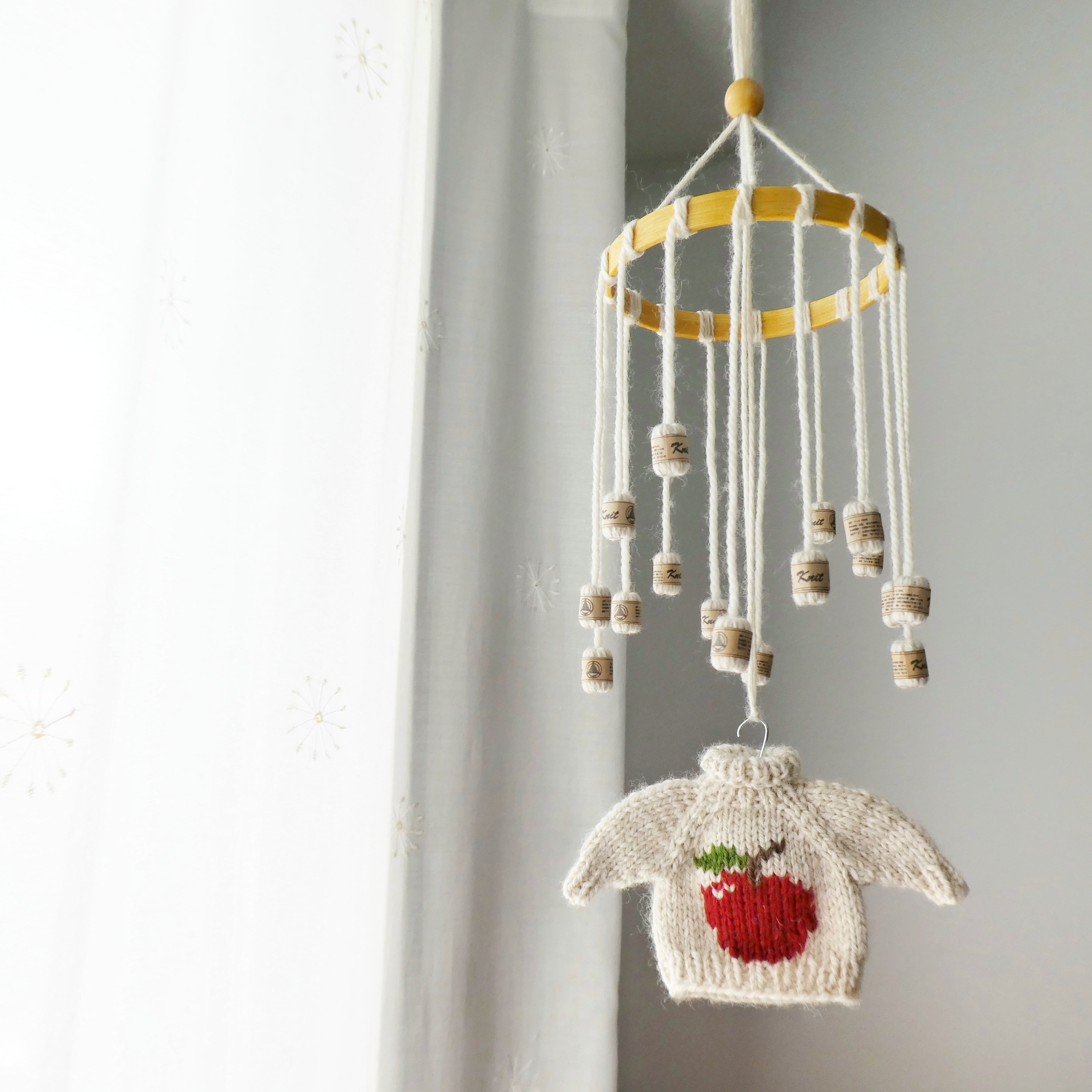 りんごの刺繍が入った手のひらサイズのセーターと、小さな毛糸玉をたくさん吊り下げた、あたたかみ溢れるモビールです。