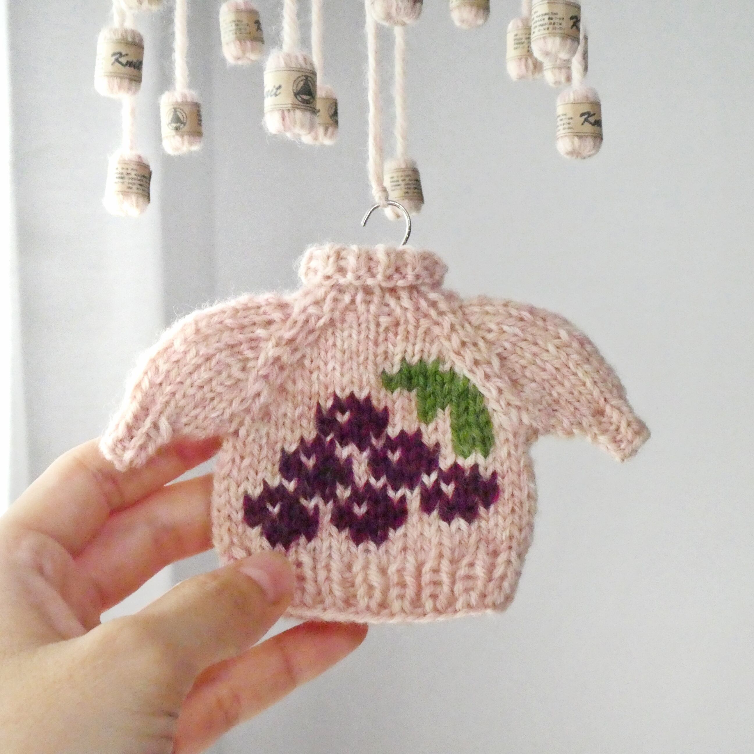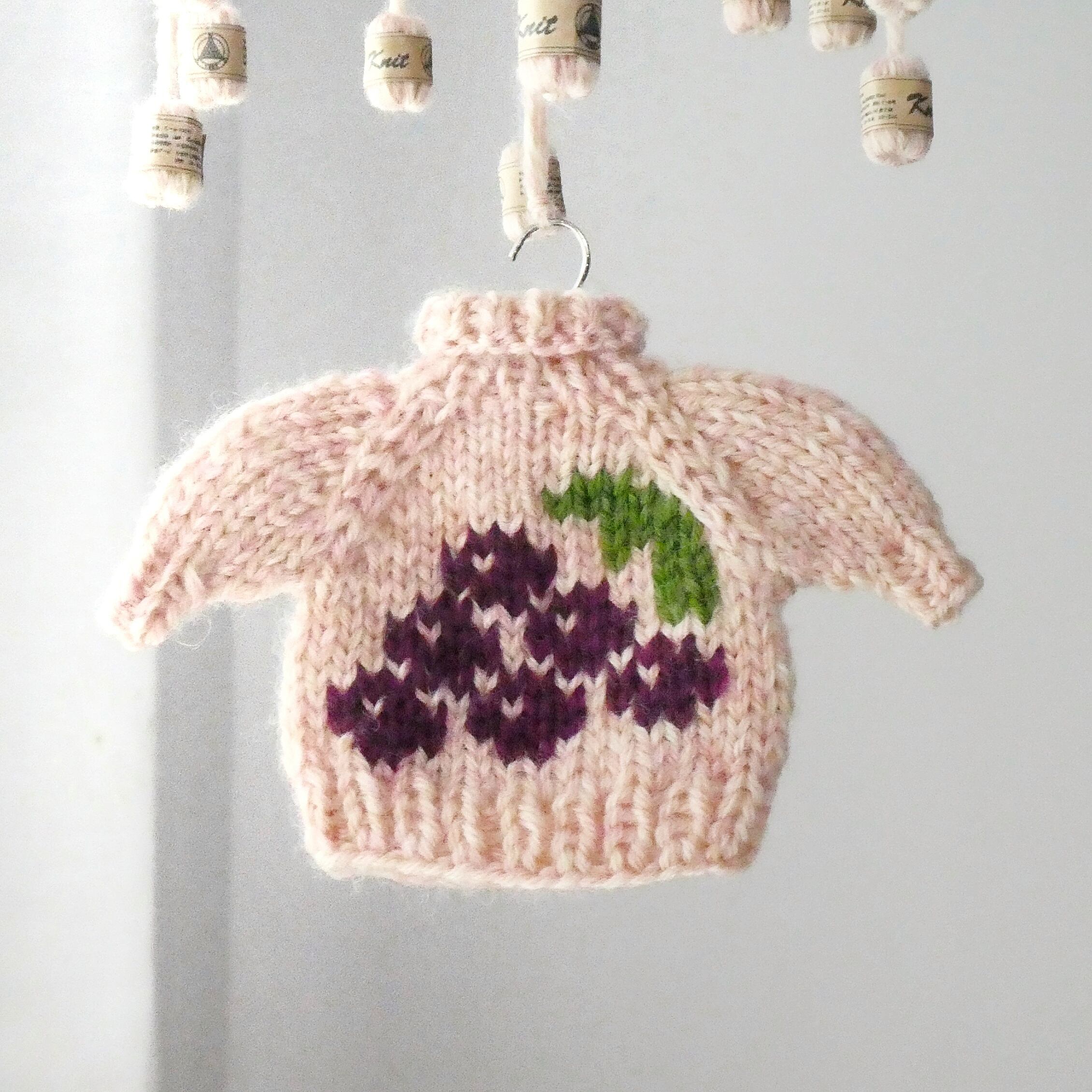 ぶどうのニットのモビール/小さなセーターとミニチュア毛糸玉/薄ピンク/受注制作-Knit Mobile: Mini Sweater with Grape Embroidery & Yarn Balls