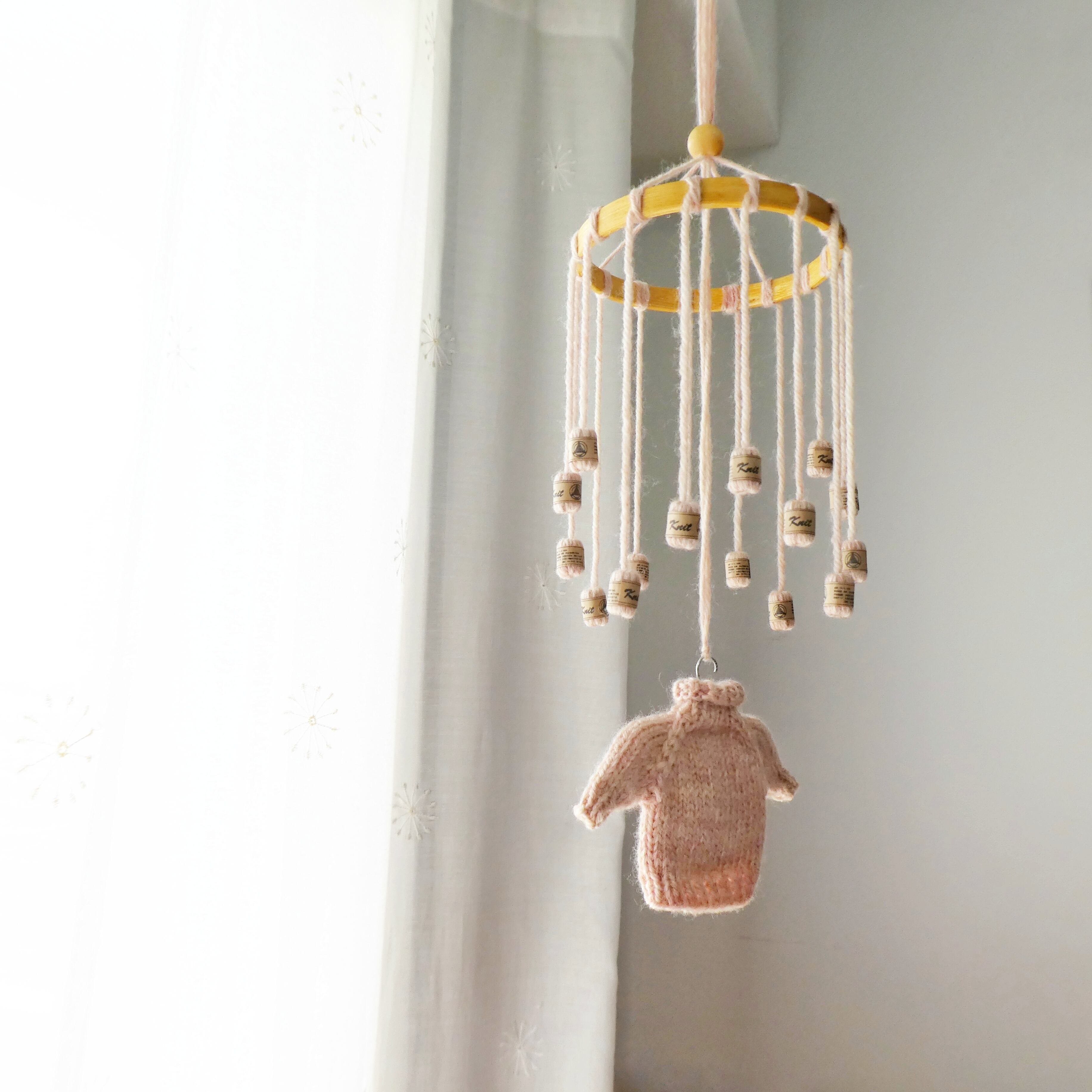 ぶどうの刺繍が入った手のひらサイズのセーターと、小さな毛糸玉をたくさん吊り下げた、あたたかみあふれるモビールです。