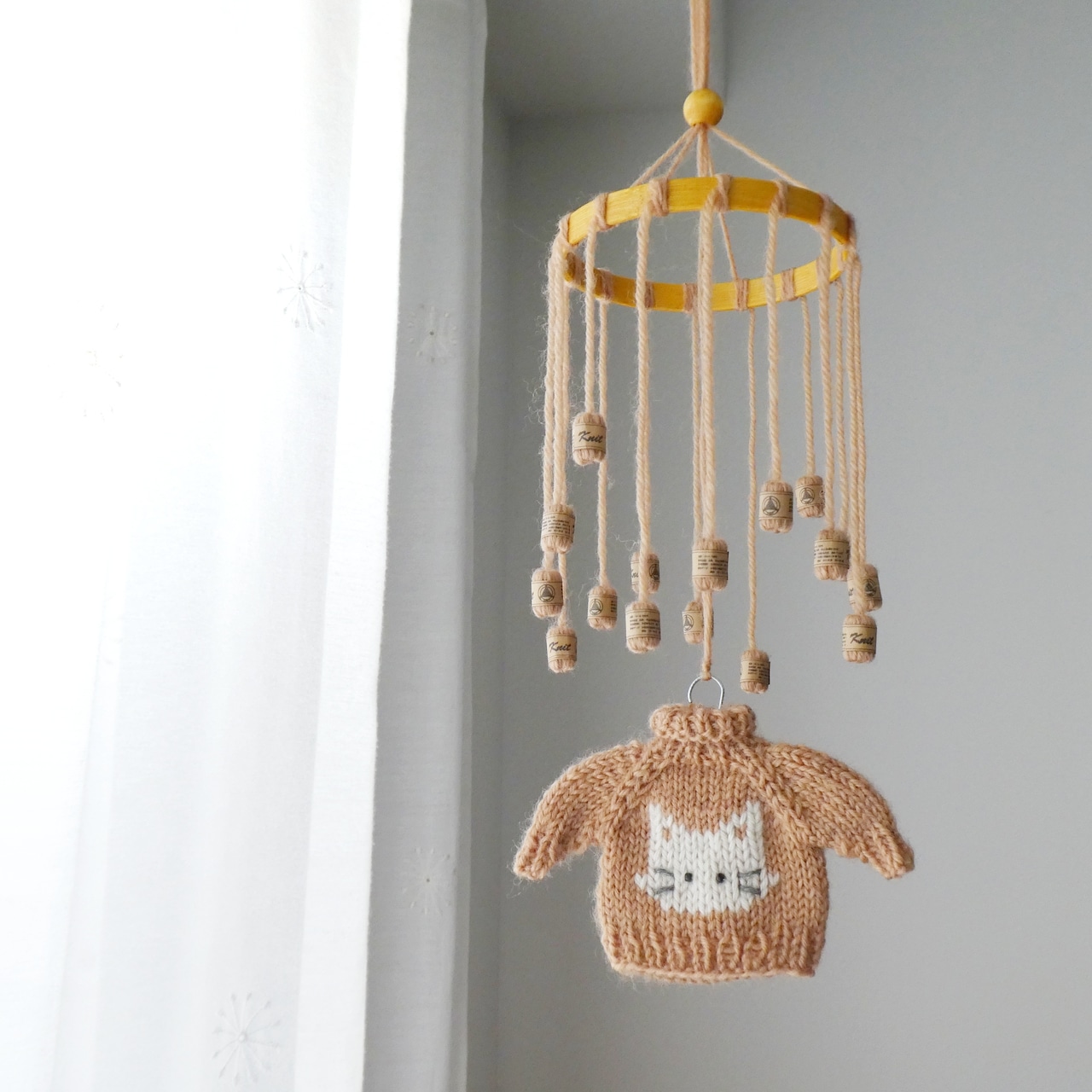 Cat Embroidered Mobile with Hand-Knitted Mini Sweater & Yarn Balls