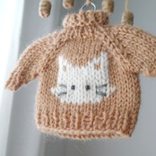 A warm and adorable handmade mobile featuring a palm-sized knitted sweater with a fox embroidery and many tiny yarn balls.